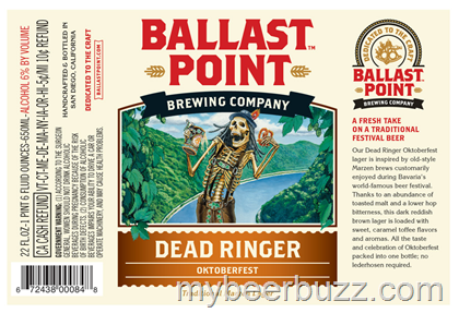 Here’s your first peek at the new Ballast Point Dead Ringer Oktoberfest as it heads to bottles. This Traditional Marzen Lager will be packaged in 22oz bottles and come in at 6%ABV…and who doesn’t love a skeleton wearing Lederhosen eating a pretzel?!