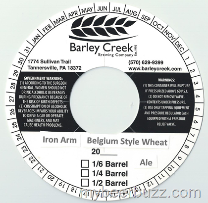 Here’s the keg label for Barley Creek Iron Arm Belgian-Style Wheat Ale.