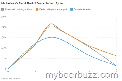 But a few conclusions were clear: Yeast in yogurt doesn't slow down the absorption of alcohol very much — perhaps only a tad. But drinking a bunch of water before and between beers might have a slightly bigger effect on peak BAC than the yeast-yogurt combo.
