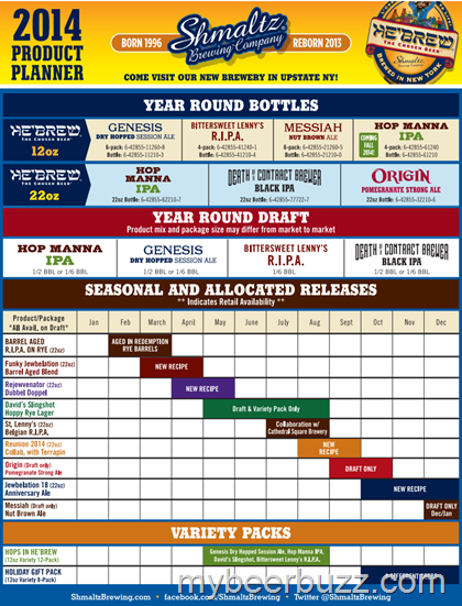 According to the Brewers Association (State Craft Beer Production & Sales Data, 2013), New York State ranks 3rd in national economic impact as they cultivate more than $2 billion per year in craft beer sales. Shmaltz is among one of the newest brick and mortar breweries to join the additional 165 craft breweries in the state. In just a little over a dozen months, Shmaltz's transition from contract brewing to operating its own brewing destiny has been a hard-earned success. For more information on their upcoming 2014 releases, please download Shmaltz's 2014 Product Planner PDF.