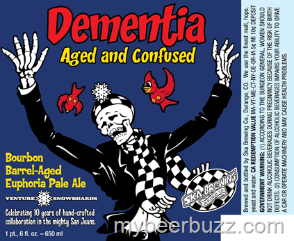 Here we have the bottle packaging for Ska Brewing Dementia Aged & Confused. This Bourbon barrel-aged Euphoria Pale Ale celebrates Ska’s 10th Anniversary and it will be packaged in 22oz bottles.