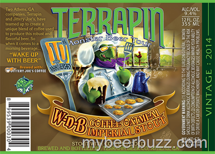 Here we have Terrapin 10th Anniversary W-N-B Coffee Oatmeal Imperial Stout 2014. This beer continues to use Jittery Joe’s coffee and this 2014 version marks the 10th Anniversary of W-N-B (aka Wake and Bake). This version will be packaged in 22oz bottles and come in at 9.4% ABV.