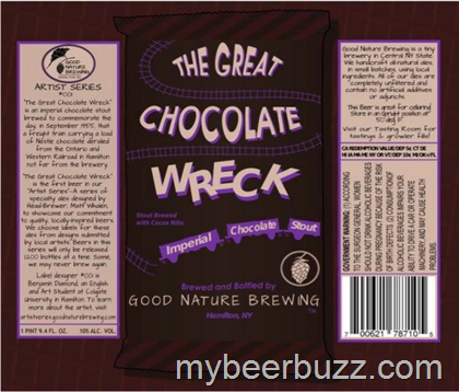 Every year, Good Nature Farm Brewery & Tap Room releases an imperial chocolate stout, brewed with cocoa nibs & cocoa powder, to commemorate the day, in September 1955, that a freight train carrying a load of Nestle chocolate derailed from the Ontario and Western Railroad in Hamilton just yards from the brewery. This historic event was dubbed “The Great Chocolate Train Wreck,” and is celebrated annually in the village of Hamilton where Good Nature is located. The Great Chocolate Wreck was officially released on 9/20 at the Great Chocolate Wreck Festival in Hamilton, but debuted in style at the Decadent Dinner at the Poolville Country Store in Hamilton.