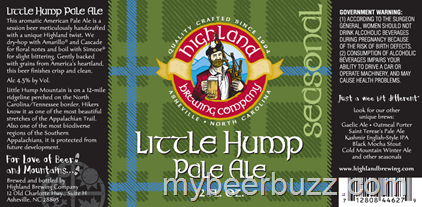 Here we have Highland Brewing Little Hump Pale Ale. This beer is dry-hopped with Amarillo and Cascade and boiled with Simcoe. This beer is named for Little Hump Mountain on the NC/TN border. Look for Little Hump to be packaged in 12oz bottles and come in at4.5% ABV.