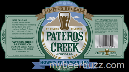 Here we have a new brew coming from Pateros Creek Brewing. This is Howe’s It Hanging IPA and it’s named for the 1888 hanging of James Howe in Fort Collins, CO for the murder of his wife (the first & only hanging in Fort Collins). Howe’s It Hanging uses Wakatu, Summit, Cascade & Nugget hops, it will come in at 6% ABV and 72 IBU. This looks like a bottle label, however the 16oz size leads me to believe it may be designed for a can so stay tuned.