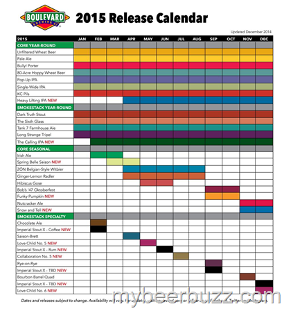 Here’s a peek at what Boulevard Brewing has in store for us in 2015. Of note are the NEW Heavy Lifting IPA, The Calling IPA, Spring Belle Saison, Funky Pumpkin, Snow & Tell as well as seven new Smokestack Series Beer.