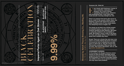 Today we get to see three versions of this beer coming from Adroit Theory Brewing in Sterling, VA.  Blvck Celebration is an Imperial Porter that uses Blackstrap Maple Syrup and Black Destruction Salt.  One version is aged on oak staves, one is aged in Whiskey barrels and on is aged in Rum barrels.  All three versions will be packaged in 12.7oz bottles and all three come in at 9.99% ABV.
