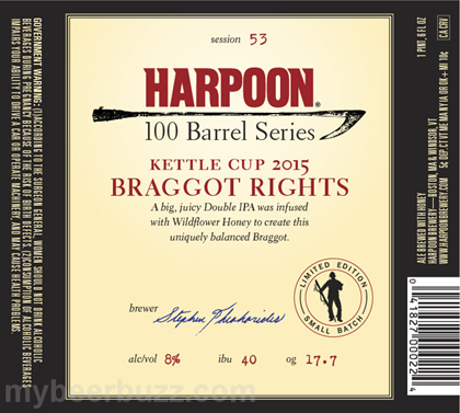 Here’s your very first look at the 53rd release in the Harpoon 100 Barrel Series of beers.  This is Braggot Rights (or A Humble Braggot) and it is the winning entry in the 2014 Harpoon Kettle Cup employee homebrew competition.  This American Double IPA was created by Steve Theoharides and it uses Wildflower Honey as a “modern tribute to the medieval Braggot style.”  Braggot Rights will be packaged in 22oz bottles and the beer will come in at 8% ABV and 40 IBU.  It also looks like Harpoon is hedging their bets and getting a second name approved for this beer:  A Humble Braggot.  Stay tuned to see which name will be released.