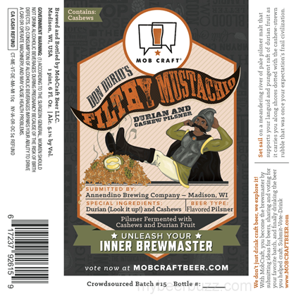 Here’s an interesting beer coming from Mob Craft in Madison, WI. This is Don Durio’s Filthy Mustachio and this crowd-sourced recipe was submitted by Annendino Brewing Co in Madison, WI. This flavored pilsner uses Durian fruit and cashews. This is a 22oz bottle and the beer comes in at 5.1% ABV.