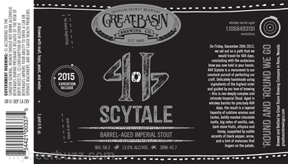 From to us from Reno, NV, this morning we have Great Basin Brewing 404 Scytale. This Whiskey Barrel-aged imperial stout is a 2015 Expedition Series release and it’s been in the barrel since Dec 20th 2013 (404 days). 404 Scytale will be packaged in 22oz bottles and the beer comes in at 13% ABV and 58.3 IBU.