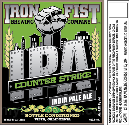 Here we have Counter Strike IPA coming from Iron Fist Brewing in Vista, CA.  This beer is packaged in 22oz bottles and it will come in at 6.5% ABV.
