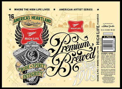 We brought you the original Harley cans, and now we get to see a new one. Here we have the Miller High Life Harley-Davidson 16oz 4-Pack can design. The beer has been “premium brewed since 1903” and the beer itself remains the same. This label is part of the American Artist Series. As a bonus we also have several more American Artists Series (there will be 5) 12oz cans featuring Joshua Noom (Independence isn’t found it’s discovered), Dan Cassaro (Traditions Never Fade), & Brandon Rike (Loyalty, authenticity & quality).