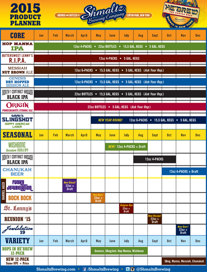 Now brewing exclusively in Clifton Park, NY -- Monday, February 23, 2015 -- Shmaltz Brewing Company starts the year 2015 in fine fashion with an ambitious brewing schedule featuring seven limited-edition seasonal brews and two variety 12-packs. This year, the Upstate New York brewery continues its award-winning barrel-aged series, hops program, Belgian-inspired releases, sessionable beers, and winter holiday offerings. Joining Shmaltz's year-round line-up in May 2015,Slingshot Hoppy American Lager® becomes a staple of their annual portfolio and will be available in 6-packs (12 oz bottles). To download the 2015 Shmaltz Product Planner, please visit shmaltzbrewing.com.