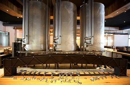 In most draught set-ups, a beer line is hooked to a keg and gas pushes the beer from the keg up to a tap where beer is poured. In our new Taproom, the draught “box” holding all of the kegs looks more like a heart machine than a beer cellar. Various gas regulators, pumps, and ports custom built at our Chico brewery allow the kegs to do what we ask of them—and we’re asking a lot. The Taproom will have five different stations where beer will flow all from the same kegs: a front bar, back bar, service bar, automatic growler filling station and, eventually, each beer will make the run up two stories to our live music venue.