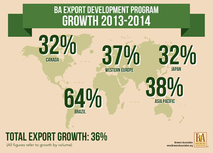 Boulder, CO • March 24, 2015—The Brewers Association (BA)—the not-for-profit trade group representing small and independent craft brewers—today reported export growth data for the American craft beer industry in 2014. Supported by the BA’s Export Development Program (EDP), craft beer export volume increased by 35.7 percent in 2014, representing 383,422 barrels and an estimated $99.7 million.