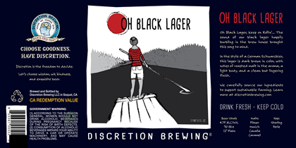 Here we have Oh Black Lager coming from Discretion Brewing Co in Soquel, CA. This German-style Schwarzbier will be packaged in 22oz bottles and the beer will come in at 4.7%-AbV and 30 IBU. .