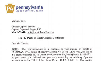 In July 2014, an attorney for a Monroeville brewery, FYBOMAX INC. (LID 57763), asked the PLCB if the brewery could, under the Pennsylvania Liquor Code and PLCB regulations, "prepare a single large container of malt or brewed beverages consisting of twelve (12) smaller containers, each holding approximately twelve (12) fluid ounces, designed to be sold as a single unit."