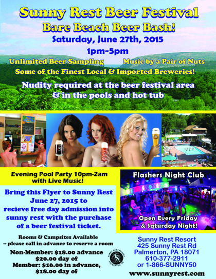 Yes it’s true….once again there will be a nude beer festival held at the Sunny Rest Resort in the Poconos. The event will take place on June 27th (1-5PM) so if you’re interested in drinking beer in the nude….the details are here. The entry fee is $20 and YES you must be nude for the event. If that’s not enough to get you excited for the event, music will be provided by the musical duo “Pair of Nuts.”