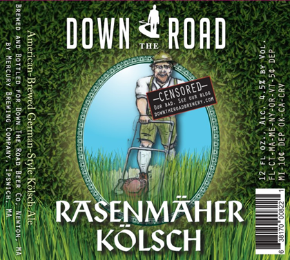 This is Rasenmaher Kolsch from Down The Road Beer in Newton, MA.  This American-brewed German-style kolsch will be packaged in 12oz bottles and the beer will hit 4.5%-AbV.  Stay tuned for details on why the label is censored.  We also have Fee des Fleurs French-style saison (8.5%-AbV). image