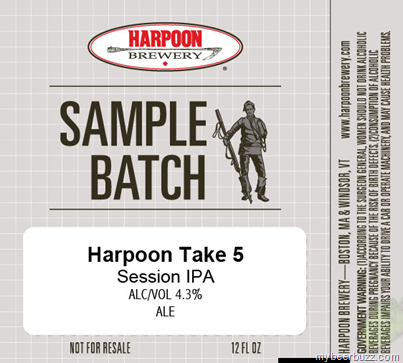 This is only a sample batch 12oz bottle and not for resale, but here we have Harpoon Take 5 Session IPA. Stay tuned for AbV and further details.