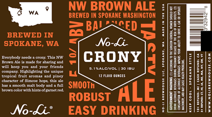 I’m excited to be the first to bring you a new beer coming from No-Li Brewhouse in Spokane, WA. This is Crony and it is a NW Brown Ale that uses Simcoe hops. Look for Crony in 12oz bottles and the beer will hit 5.1%-AbV.