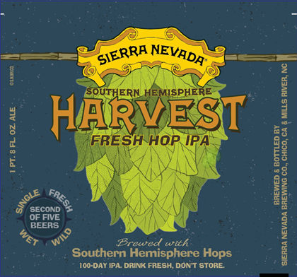 Here we have Sierra Nevada Southern Hemisphere Harvest Fresh Hop IPA. This 100-Day IPA is the 2nd in a series of five yearly bottled fresh single hops IPAs to come from Sierra Nevada. This beer uses spring harvested new Zealand hops that are picked and brewed in less than a week, it will be packaged in 24oz bottles and the beer will hit 6.7%-AbV.