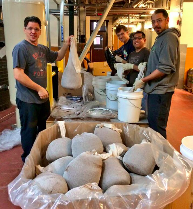 A crew of 70 friends and family was assembled and divided into three roles: grinders, portioners, and the ever glamorous clean up crew. They worked in two shifts over the course of three nights to package 240 bags each containing ten pounds of coffee. On the day of delivery, Vincent assisted Dustin and Joshua along with a crew of Boulevardians in suspending the freshly ground coffee in porous bags in our stainless steel fermentation vessels. Once the coffee was in place, our brewers transferred finished porter into the tanks for a 48 hour extraction period. Since we were dealing with finished beer that was chilled, the extraction mimicked the process employed for brewing cold brewed or toddy coffee. The lower temperature results in an extraction of beautiful flavor and aroma from oils in the coffee without the acidity associated with a typical brew.