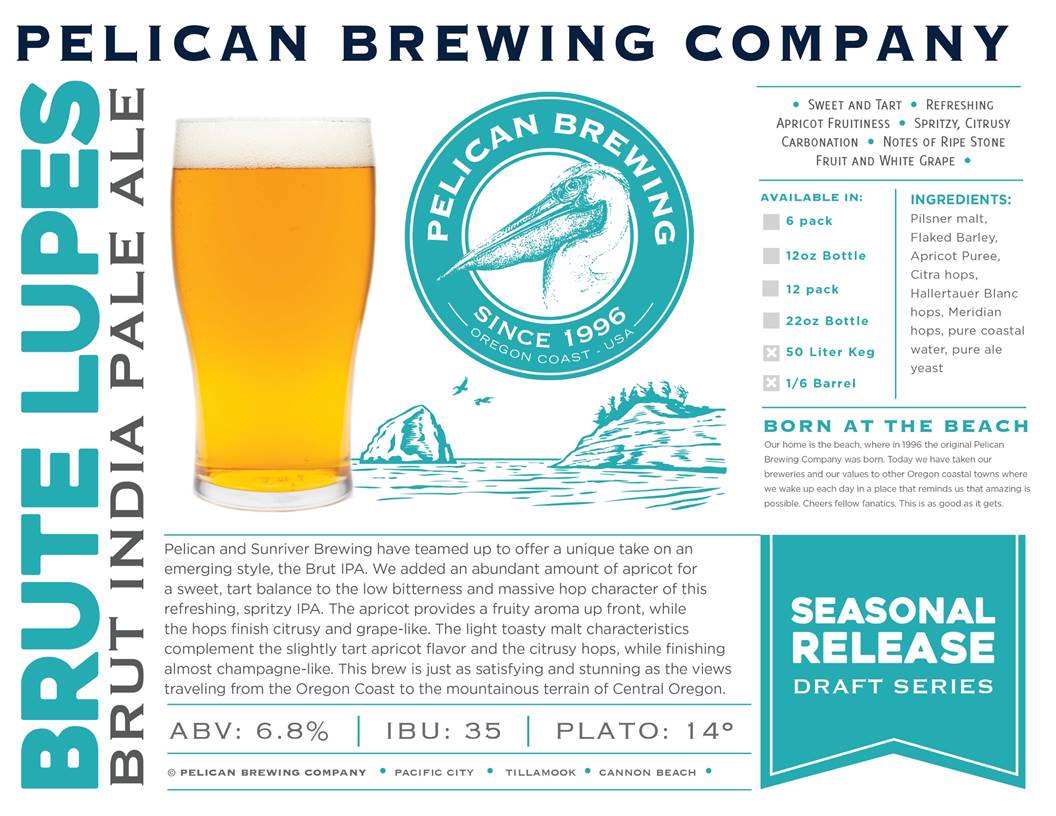 Pacific City, OR (March 7, 2019)— Pelican Brewing Company and Sunriver Brewing Company have teamed up to offer a unique take on an emerging style, the Brut IPA. Introducing Brute Lupes—a light-bodied new small batch brew perfect for a lighter springtime enjoyment. The Brut IPA is available now on draft at Pelican brewpubs and other participating watering holes.
