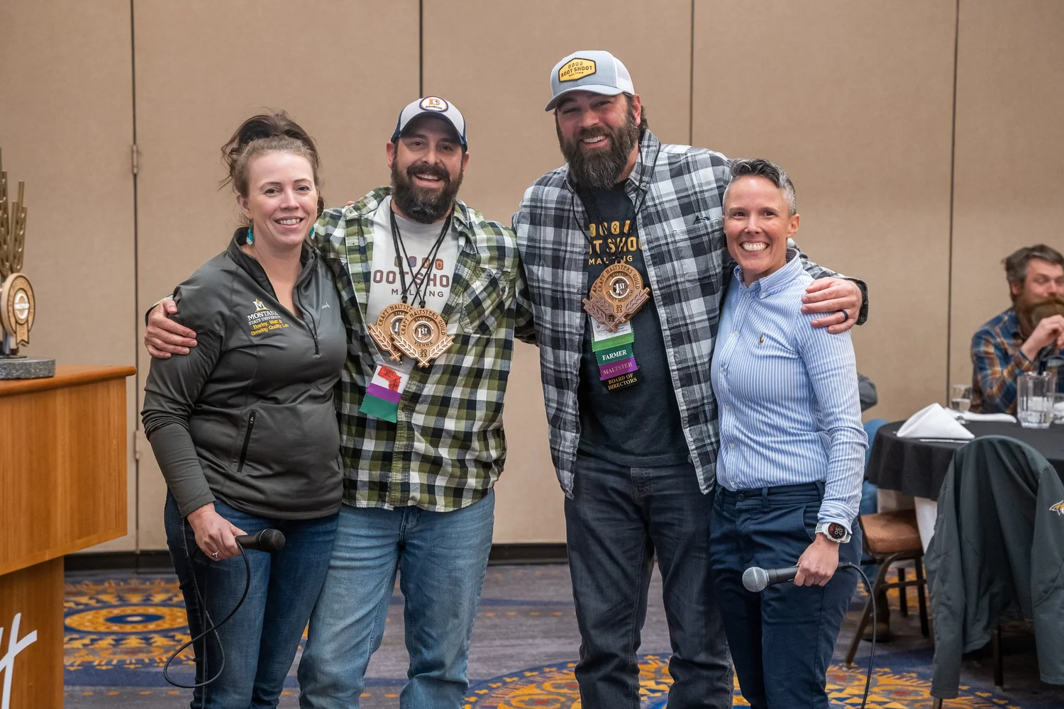 Image courtesy @activebeergeek; From left: Hannah Turner, MSU; Michael Myers, Root Shoot Malting; Craig Miller, Root Shoot Malting; Lindsay Barr, DraughtLab    zzubreebym